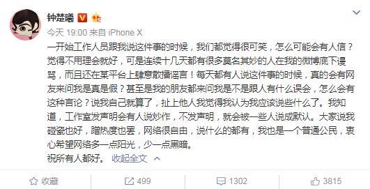25日,@钟楚曦工作室 发声明称本想对不实言论做“谣言止于智者”“清者自清”的方式低调处理,但是被不实