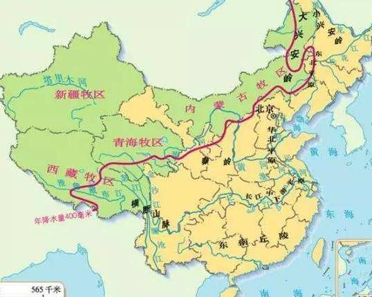 图中的红线就是400毫米等降水量线。可以看到以北京为核心的华北平原北部地区正好是汉地的边界。
