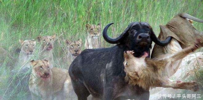 落单野牛在草原上悠闲的吃着青草,谁知道突然从不远处跑来了一群狮子,野牛很快就被狮子围了起来,狮子是不敢三七二十一上去就对着野牛展开了攻击,谁知道最前面的一头狮子刚近身野牛就被当头顶起放倒在地!野牛:教你们怎么好好做狮!