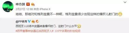 面对武磊这粒世界波,著名解说员申方剑发表了看法:“哈哈,武磊这球绝对和格列兹曼不一样啊,格列兹曼很少出现这样的爆杆儿射门的!”