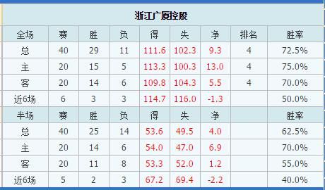 浙江广厦目前29胜11负排名第四,广厦后面的赛程凶险,要想保住前四名争取季后赛主场优势,今晚必须拿下山东队。广厦队本赛季状态不佳,面对前6球队都输球,而且还输给同曦队两次。不过70%的客场胜率体现了广厦队的整体实力。