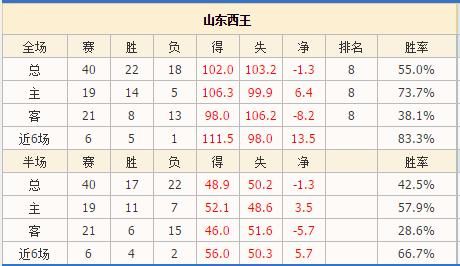 山东西王金星22胜18负排名第8,领先第13名两个个胜场,在常规赛只剩6轮的情况下,山东队进季后赛已十拿九稳,目前是争取超越福建拿下第七名。山东队本赛季由于外援出现伤病,导致战绩不是很理想,不过主场的战绩仍然惊人,14胜5负73.7%的胜率,而客场只有38.1%的胜率。