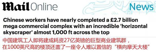 英国《每日邮报》用了整整三行的标题这样形容:“中国建筑工人即将建成耗资27亿英镑的巨型商业建筑群,在1000英尺高的楼顶还盖了一座令人难以置信的‘横向摩天大楼’”。