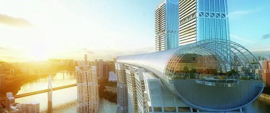 说“横向”,是因为8幢拔地而起的摩天大楼群里,赫然出现一座“躺着”的楼。这座长度超过300米的廊桥形建筑在60层楼的高空将其中四幢摩天大楼连接起来,瞬间把建筑群变成3D的“风帆”。