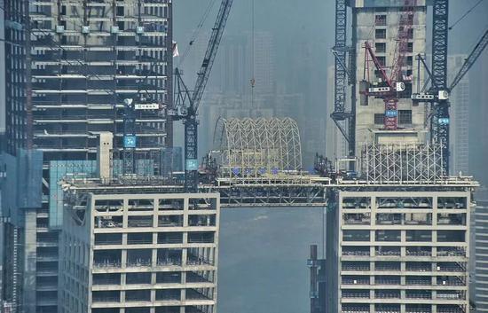 更令外媒感到不可思议的是,用来连接4座大楼的三个分段均有1100吨重,它们在地面建造好后,需用起重机吊到近300米的高空再与大楼连接,形成廊桥。