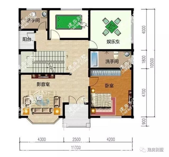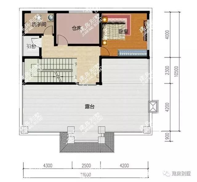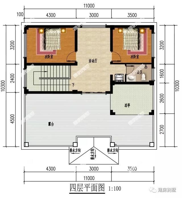 户型二:面宽11米,进深10.5米,墙面用面砖和真石漆装饰,屋面也是平的,四周用红瓦装饰。