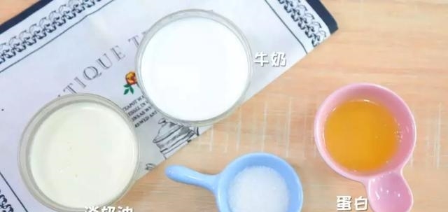 食材准备:蛋白45克、牛奶80克、淡奶油80克、糖10克