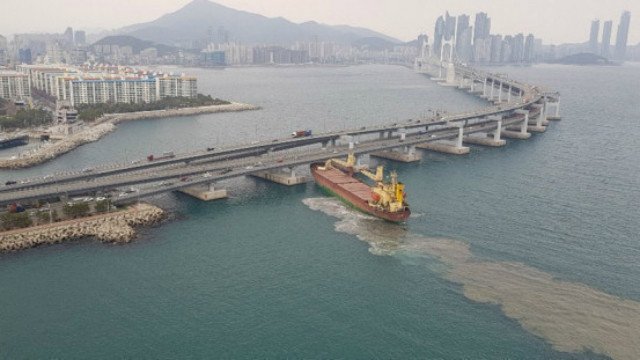 事情是这样的,根据《韩联社》报导,2月28日下午4点左右,6000吨级俄籍货轮「西格兰号」(Seagrand)离港后直接往釜山内陆方向驶去,先是撞毁了一艘停在码头的私人游艇,船头接着猛然撞上当地的地标广安大桥,船头上的吊臂应声折断,而桥侧金属结构也留下一个深深的凹洞。
