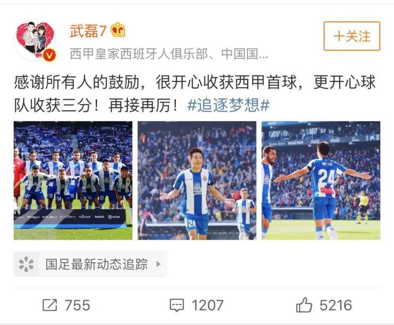更新微博,感谢球迷的同时也不忘自我勉励。