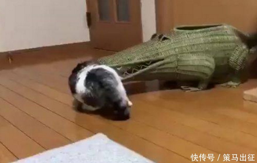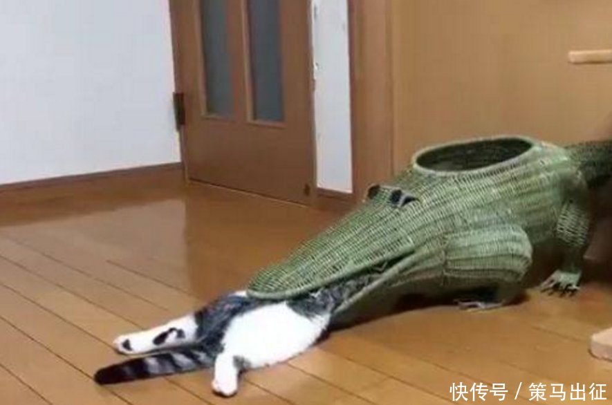 这只猫不走寻常路,鳄鱼背部明明有一个圆形的口子,它非要从鳄鱼嘴巴进去,鳄鱼嘴巴不是长得很开,它每次进去都要慢慢挤进去,可惜它身材太胖了,每次进去一半的时候都要卡在那里,然后休息一会再继续往里面钻。