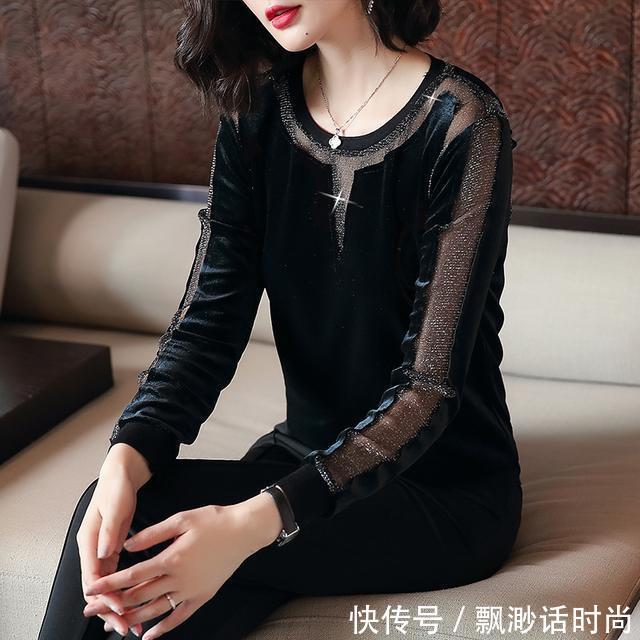 2019新款金丝绒时尚小衫黑色长袖T恤亮