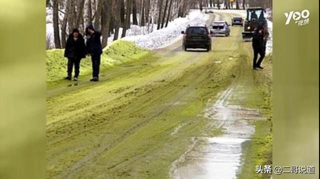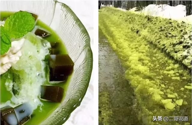 这些地方,白色和绿色的雪堆积在路边或是居民屋前,看着这些绿色的雪,网友们纷纷调侃:想尝一尝,看看是不是抹茶味的。