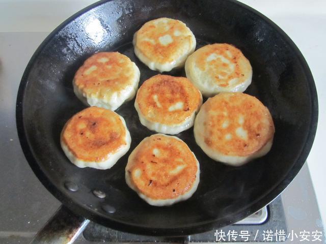 10.揭开盖小火慢慢煎, 直至馅饼双面煎至金黄。