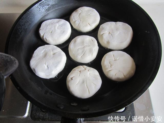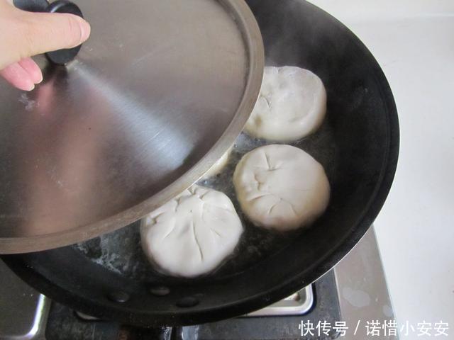 8.烧热锅, 放入少许油, 将馅饼的正面朝下放入锅中稍煎一下, 再加入少许水;
