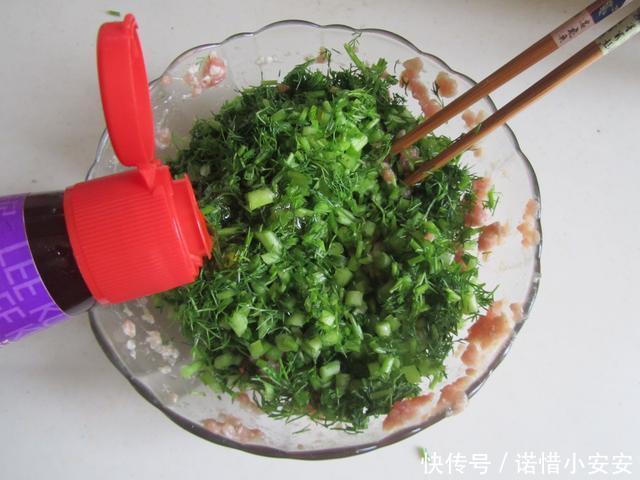 4.将茴香碎放入肉馅中, 先加入适量的芝麻香油拌均匀, 再加入点盐调味, 这样能避免蔬菜出水;