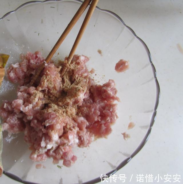 3.肉馅中加入适量的盐、淀粉、胡椒粉和生姜粉等调味料, 顺着一个方向搅拌上劲;