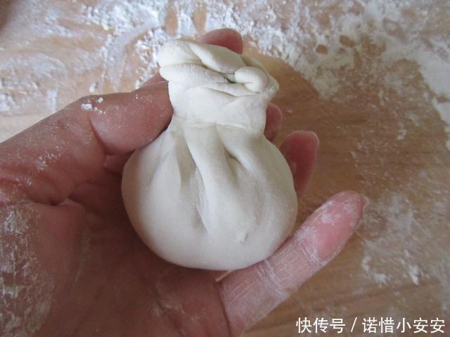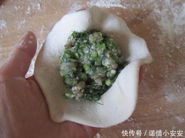 6.将面团擀成圆片, 包入适量的准备好的猪肉茴香馅;