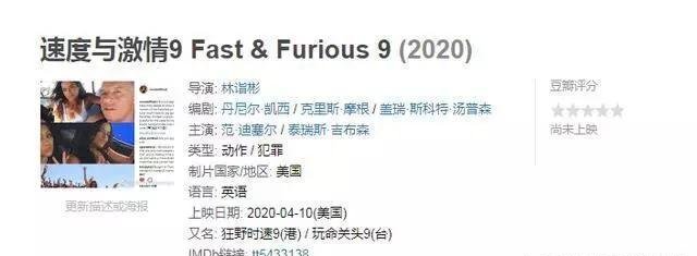 要说能够和《复仇者联盟3》媲美的话,应该就只有《速度与激情》系列了吧,《速9》是《速度与激情》系列电影的第九部,相信大家前8部都有看过吧,第9部是由美国环球影业发行,由林诣彬指导,范·迪塞尔等主演的动作片。影片由原定上映时间2019年4月19日被推迟至2020年4月10日上映。