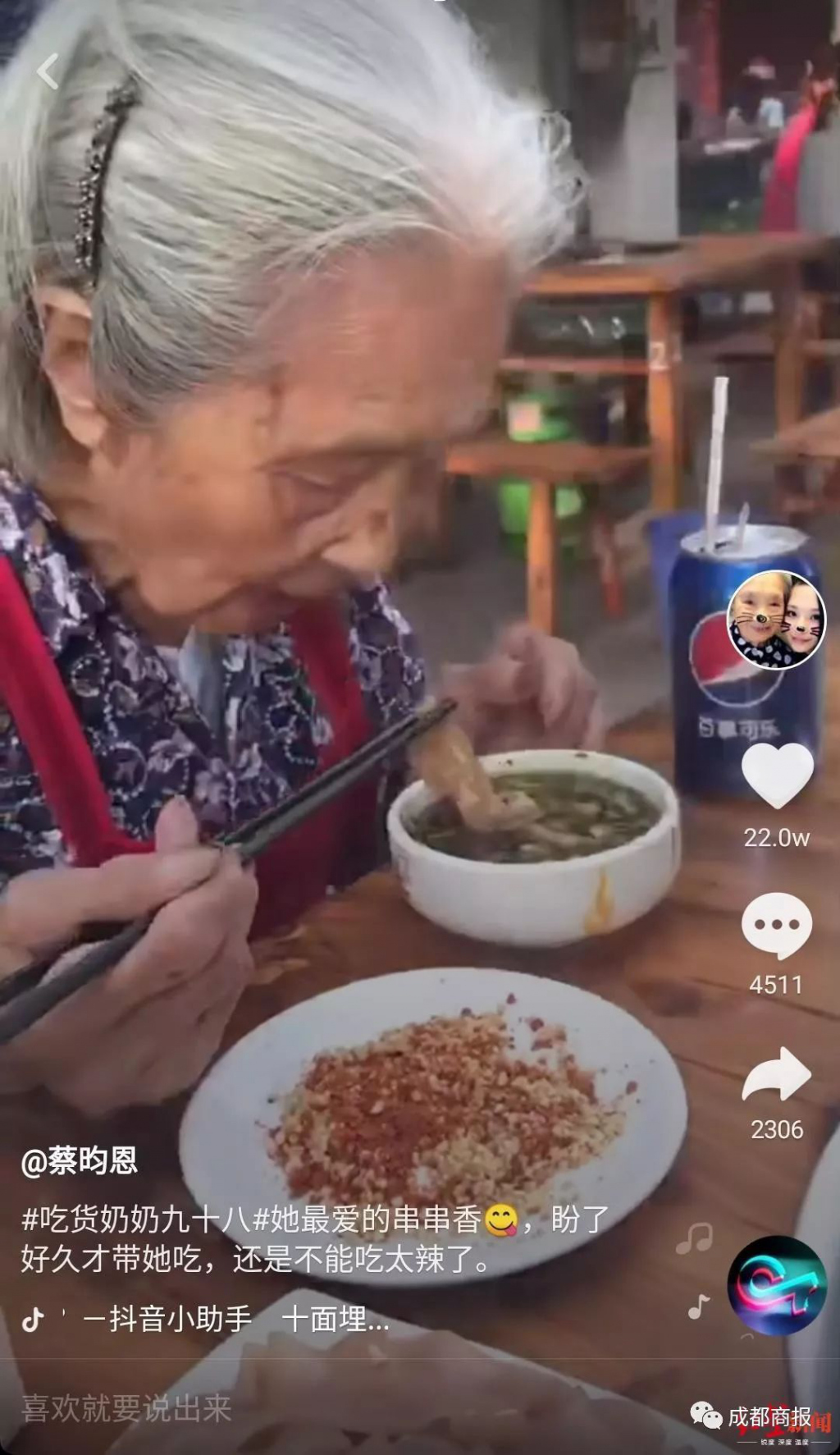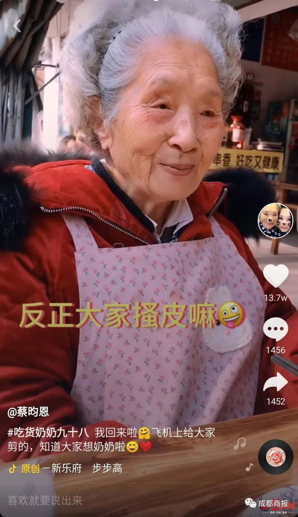 大约两个月后,她才发了奶奶的第二个小视频。视频里,奶奶吃汉堡时假牙掉了出来,被赞 7.1 万。第三个视频里,奶奶烫鸭肠、蘸干辣椒碟、喝可乐,22 万赞。"我觉得可能是反差引来了关注。"蔡女士猜想,可能奶奶和多数老人不一样,"她喝可乐、吃汉堡,还喜欢吃辣,又吃得很油,更像是年轻人的生活,而且看起来似乎不健康,但她又很长寿。"在她看来,视频火源于奶奶的"年轻态",也因为她和常规"养生"意识的反差。"还有,我感觉奶奶说话时,透出一种纯真。"