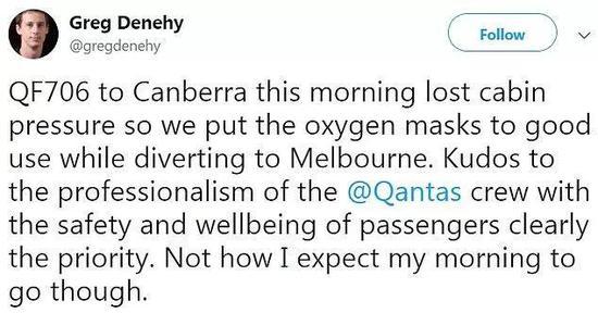 这位乘客表示,QF706航班今早在飞行过程中机舱失压,大家都戴上了氧气面罩。在此给Qantas机组最高赞誉,机组反应迅速,保证乘客安全。我的早晨没有像我想的那样。