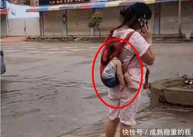 大街上一名女子穿着睡衣在打电话,而孩子用一个背带背着,女子就这样打着电话,而背后的宝宝看着好像都快掉下来了,女子竟浑然不知。