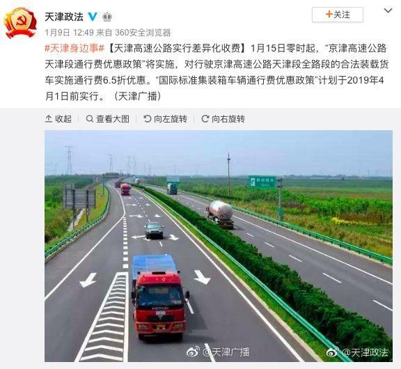 2019年1月15日零时起,京津高速公路天津段实施通行费优惠政策,对行驶京津高速公路天津段全路段的合法装载货车实施通行费6.5折优惠。