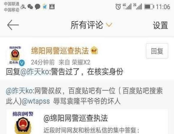 随后,绵阳网警快速警告“wtapss”立即删除不当言论,但该名网友却转移话题,并对网警进行辱骂,目前网警正在核实这名网友的真实身份。