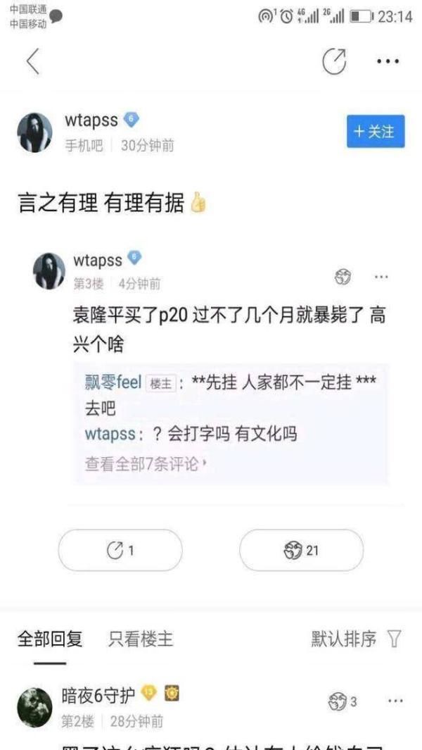 不料被网友“wtapss”看到后,竟对袁老出言不逊:“袁隆平买了P20过不了几个月就暴毙了,高兴个啥”。此言一出,引发网友众怒,纷纷对此人进行批评教育。但其毫无悔改之意,还口出狂言。