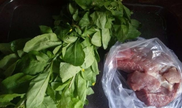 需要食材:新鲜的枸杞叶一把、瘦肉一块