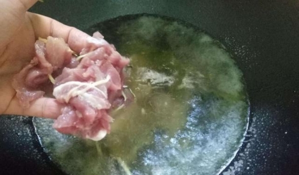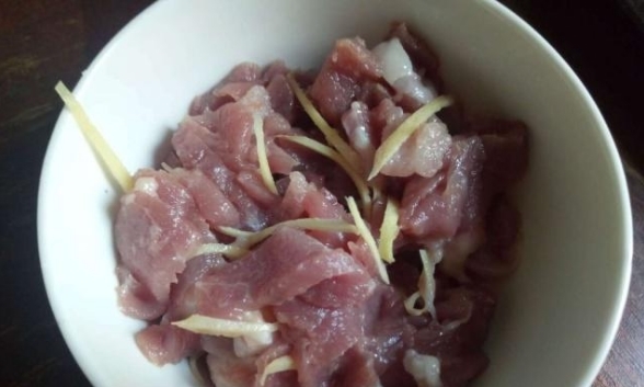 第一步:先将猪瘦肉清洗干净,然后用刀切成小薄片装入碗中之后就开始腌制。腌制的时候在肉中放入小半勺的盐、一小勺的嫩肉粉。适量的姜丝,戴上一次性手套之后,用手抓拌均匀搁置十分钟左右,腌制入味