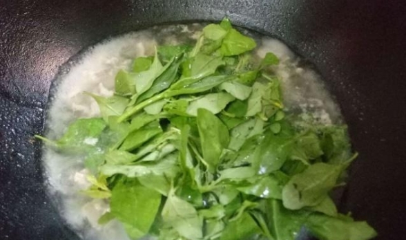 第五步:将瘦肉煮熟之后放入沥水好的枸杞叶,将枸杞叶放下去,用筷子稍微翻个面就可以了,枸杞叶不宜煮过长时间,用开水稍微烫一下就算是完成了