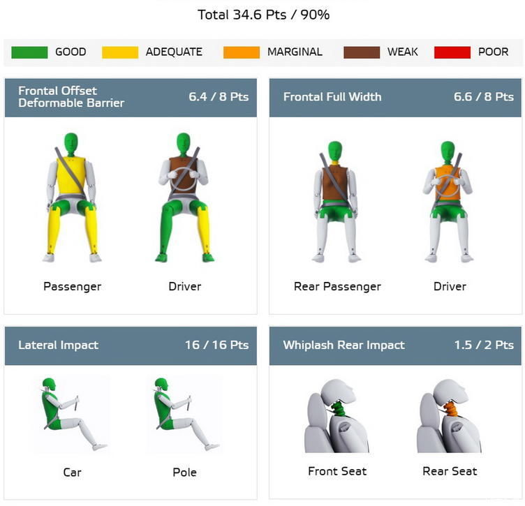 没想到的是拥有方正车头的大G对于行人撞击保护也得到了不错的分数,从行人受伤程度分布图分析,最容易造成创伤的双脚、小腿和腰部位置对应在引擎盖与中网衔接处以及前保险杠的位置可以得到「Good」的绿色成绩,除了重新修改的保险杆发挥作用外,标配含行人及自行车侦测的AEB主动防碰撞预警制动、车道辅助等也加持了不少,当然这也反应出在安全辅助的得分也不低。