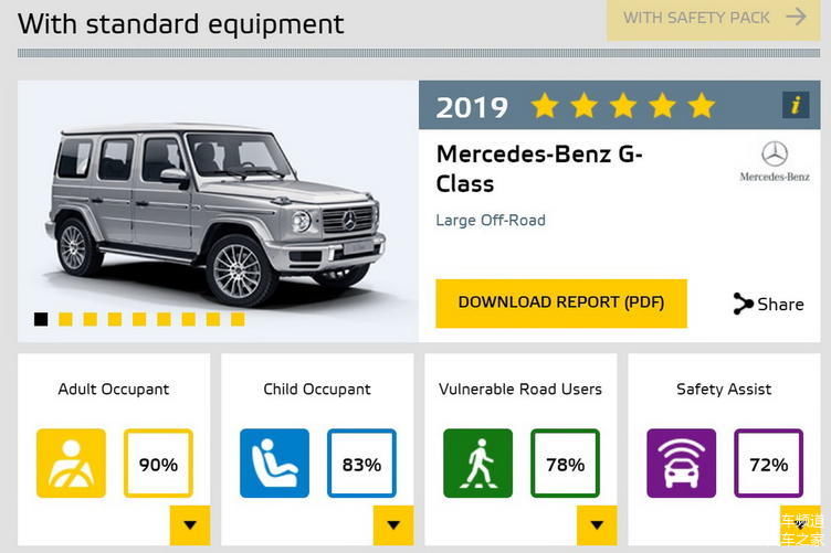 参加本次Euro NCAP的受测车型为入门柴油车型G350d,在四大项目中成人保护、儿童保护、行人保护以及安全辅助系统等方面分别拿下90%、83%、78% 和 72% 的出色得分。