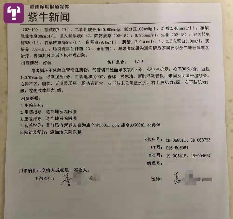 据他介绍,今年1月31日,他的父亲骑电动车摔倒,这一摔几乎摔进了鬼门关。2月1日脊椎手术,术后在ICU里肺部感染严重,2月12日做了气管切口手术。经过19天的漫长治疗,医院说可以出ICU了,出院小结上显示伤口甲级愈合。
