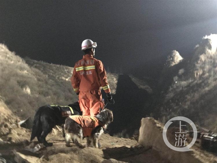消防搜救犬也到场参与救援。摄影/山西天龙救援队