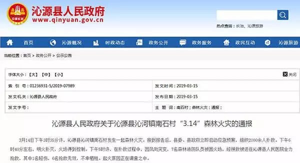 3月14日下午3时35分许,沁源县沁河镇南石村发生一起森林火灾。接到报告后,县委、县政府立即启动应急预案,组织2000余人扑救。下午6时40分左右,明火扑灭,火场得到控制。下午5时许,在扑救过程中,因风向突变,7名森林消防队员被困火场,经搜救被送往沁源县人民医院全力抢救,其中1名轻伤,6名抢救无效,不幸牺牲。起火原因正在调查之中。