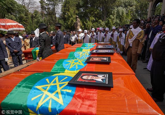 埃航坠机事件中遇难的乘客和机组人员的棺材在塞拉西教堂(Selassie Church)前排列整齐。