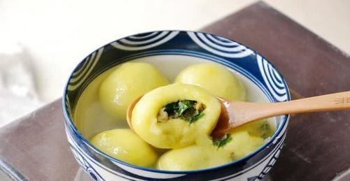然后再把准备好的几个土豆清洗干净之后去皮切薄片,放在蒸锅中蒸熟之后再稍稍放凉的时候压成土豆泥,接着加入少许的盐和淀粉揉成面团之后再分成和饺子皮大小的剂子,之后再擀成和饺子皮大小差不多的面皮,包入准备好的饺子馅儿,之后收口揉搓成小圆子的形状,之后锅中加入适量的水,烧开之后再把做好的这些土豆肉丸子放入锅中,大火煮沸之后再加入两次冷水,再次煮到这些土豆丸子,漂浮起来即可。就能吃饭了,距离炒土豆丝好吃,更比吃饺子的时候有味道,而且能当菜又能当主食,可以说吃多少年都不腻歪,不知道大家是否喜欢这个土豆的吃法呢。
