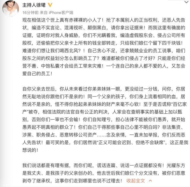 3月18日,在有媒体报道“李氏家族首次回应”后,徐珺在微博(@主持人徐珺)写出大段文字,称有人“编造不实言论、混淆视听、颠倒黑白”,并首次透露诸多细节,称有人将其丈夫卡中大量现金转走,“只给我们娘仨个留下四千块钱”!