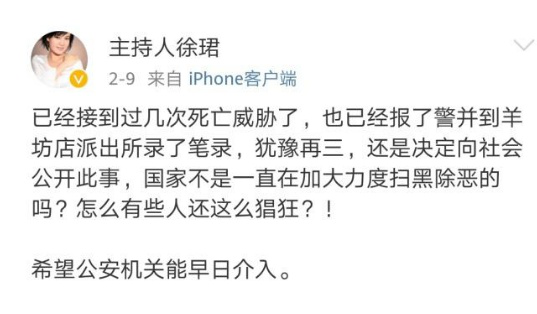 但就在一审胜诉后不久,徐珺却在微博称:“已经接到过几次死亡威胁了,也已经报了警并到羊坊店派出所录了笔录,犹豫再三,还是决定向社会公开此事,国家不是一直在加大力度扫黑除恶的吗?怎么有些人还这么猖狂?!希望公安机关能早日介入。”