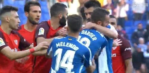 当镜头转过来时,两队已经纠缠在了一起,爆发火爆的冲突。由于两队球员人数太多,镜头并没有交代清楚是谁引发的冲突!随后,慢镜头显示是塞维利亚门将挑衅对手,这也引发了西班牙人球员的不满,因而两队起了冲突。