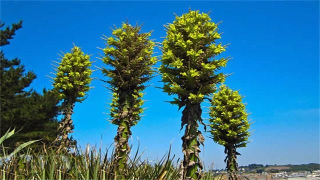 有不少小伙伴们都知道,凤梨也就是菠萝,在开花的时候是很多花朵聚集在一起,然后凝结成一个果实的,这种食羊树也是一样的,不过在这种树花朵盛开的时候,却生长出了一种剃刀状的花刺,这种伸出来的荆,就是这种树的强大武器,可以防止食草动物对这些花朵的啃食。