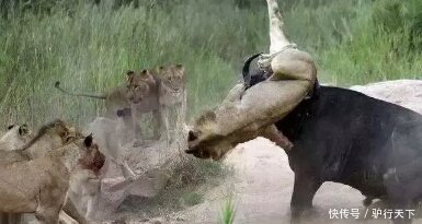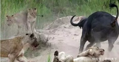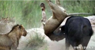 小野牛被咬死了,母牛看到自己的孩子被杀,发疯似的冲进狮群,接下来的场面,摄影师看了一个个的张大了嘴巴。狮子还没见过敢冲撞自己的情景,一个个都没反应过来呢,母牛当场冲着一头狮子顶去,狮子被野牛顶起来后,野牛狠狠的将其摔在地上。