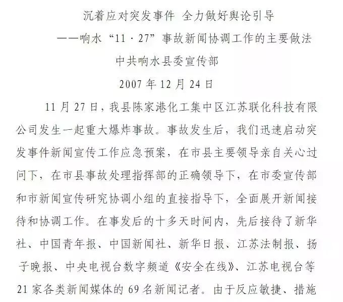 据南都、第一财经等媒体报道,2007年“11·27”事故发生后,以事发地响水当地有关部门的口吻发布的一篇“奇文”——《沉着应对突发事件 全力做好舆论引导——响水“11·27”事故新闻协调工作的主要做法》,引发广泛关注。