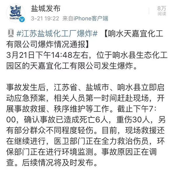 截至19:00,确认事故已造成死亡6人,重伤30人  据@盐城发布,截止19:00,确认事故已造成死亡6人,重伤30人,另有部分群众不同程度轻伤。目前,现场救援还在继续进行,医卫部门正在全力救治伤员,环保部门正在进行环境监测。事故原因正在调查。后续情况将及时发布。