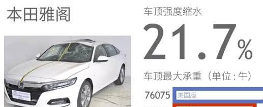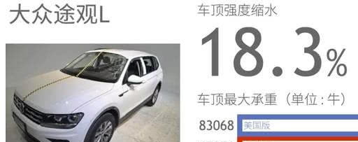 排在第一名的是本田的雅阁!美版雅阁车顶能承受7万6千多N的力量,中国版只能承受5万9千多,缩水达到近22?第二名是别克的昂科威,美版可承受83761N,而国版只有67823N,缩水大概19?第三名就轮到大众了,大众途观L在美版车顶能承受83068N,中版只有67876N,缩水达到18.3!