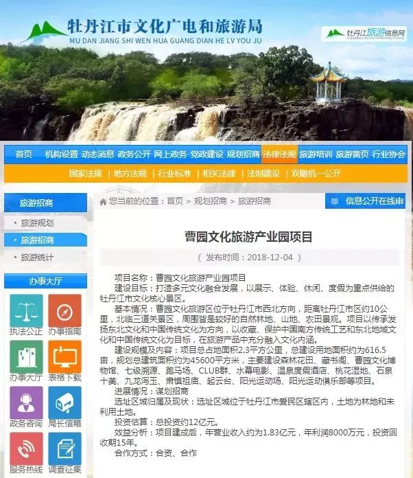 在牡丹江市文化广电和旅游局官网“规划招商”一栏,周刊君看到一份名为《曹园文化旅游产业园项目》的文件,发布时间为2018年12月4日。该项目估算总投资约12亿元,总占地面积2.3万平方公里,建成后年营业收入约为1.83亿元。