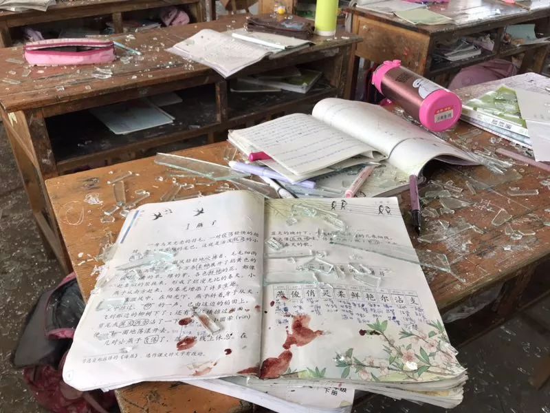 一瞬间,玻璃震裂,碎片被崩得到处都是,靠窗的两个铁书柜也被气浪掀翻,一个砸在了地上,一个挺着没倒下来。老师喊着,让学生们赶紧跑。