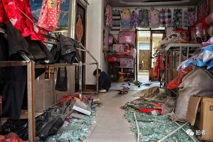 王商村的一家商铺中,满地都是碎玻璃。新京报记者彭子洋摄