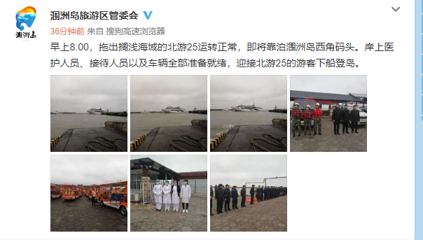 据广西北海市涠洲岛旅游区管委会官方微博消息,24日早上8:00,拖出搁浅海域的北游25运转正常,即将靠泊涠洲岛西角码头。岸上医护人员、接待人员以及车辆全部准备就绪,迎接北游25的游客下船登岛。早上8:30,北游25的游客安全下船登岛!